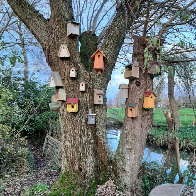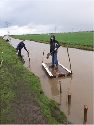Het was geen grote groep maar er is toch ontzettend veel werk verzet. De aanleg van een natuurlijke beschoeiing. Jan had veel voorbereidend werk gedaan in de krokusvakantie zoals wilgen knotten, palen slaan en een begin met het vlechtwerk gemaakt. Uiteindelijk is er erg veel hout en houtsnippers in gegaan en voila: