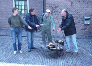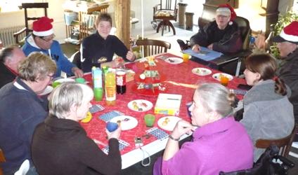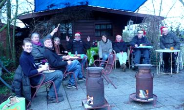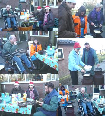 De geplande kerstviering op 23 december moest helaas worden afgelast. Er lag nog té veel sneeuw. De regiotaxi’s hadden al een paar dagen niet gereden. Dus werd het dit jaar een Nieuwjaarslunch. Eerst moesten de dieren nog gevoerd en verzorgd worden. Nadat we een tijdje achter de ontsnapte varkentjes Miss Piggy en Hamlet ons warm hadden gelopen, konden we de viering gaan voorbereiden. Ondanks de sneeuw en de vrieskoude wilden iedereen toch buiten pannenkoeken bakken op melkbussen. Joop sleepte kruiwagens vol hout aan om de vuurtjes aan te houden. Wonderlijk genoeg had niemand het koud. Warme chocolademelk en pannenkoeken met kaas waren favoriet. Remco had voor sterretjes gezorgd dus laat 2010 maar komen. Daarna was er dolle pret bij het ganzenborden.