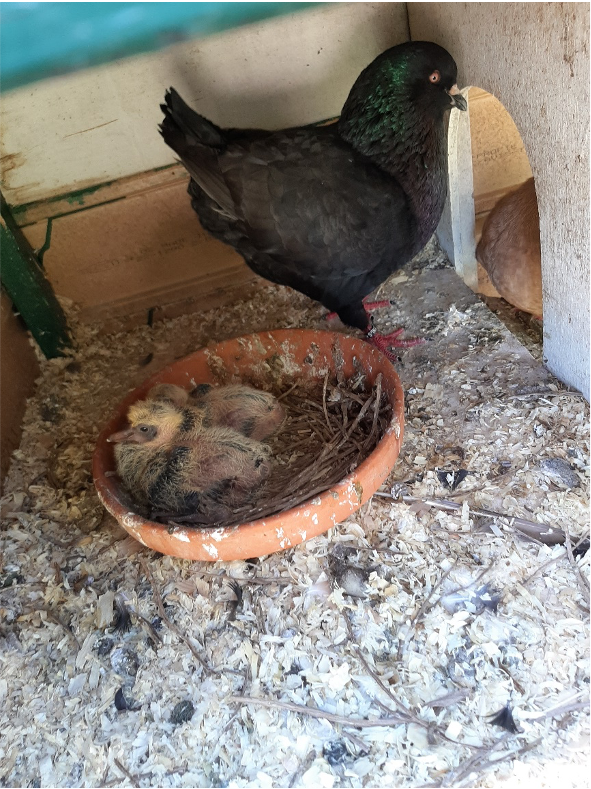 De kipduiven zijn uit hun eieren gekomen. We mogen ze even zien van moeders.